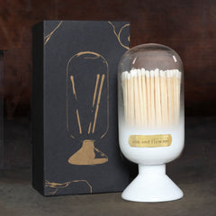 Our Mouth-Blown Match Cloche with 100 - 4” Matches. There is a striker on the back of the glass so you can fire up that flame just like that! There’s a cork at the bottom to pull out the matches so they are refillable as needed. Bougie up your home with our match holders! Plus a great gift (for yourself too).